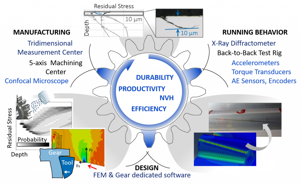 GIE’s main lines of research focus on the interfaces between concepts of manufacturing, design, and the dynamic behavior of gears and transmission components. Among the topics already explored by the group are investigations into assessing surface integrity, predicting the state of residual stresses, powder metallurgy, additive manufacturing, new transmission architectures for wind turbines, contact fatigue, and new steels for gears.